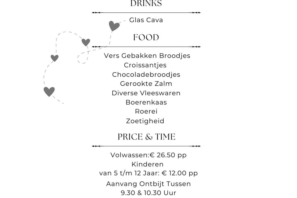 Alle dranken kunt op basis van nacalculatie bestellen. de kosten van het moederdagontbijt: € 26,50 per persoon | kinderen 5 t/m 12 jaar € 12,00